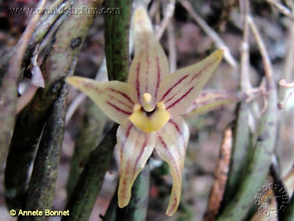Found in Minas Gerais and Rio de Janiero states of Brazil in primary forests at elevations around 1200 meters as a mini-miniature sized, cool growing epiphyte with an erect, woody stem enveloped by sheaths and a terete, light green leaf that blooms in the fall on a short, single flowered inflorescence arising from the leaf base
