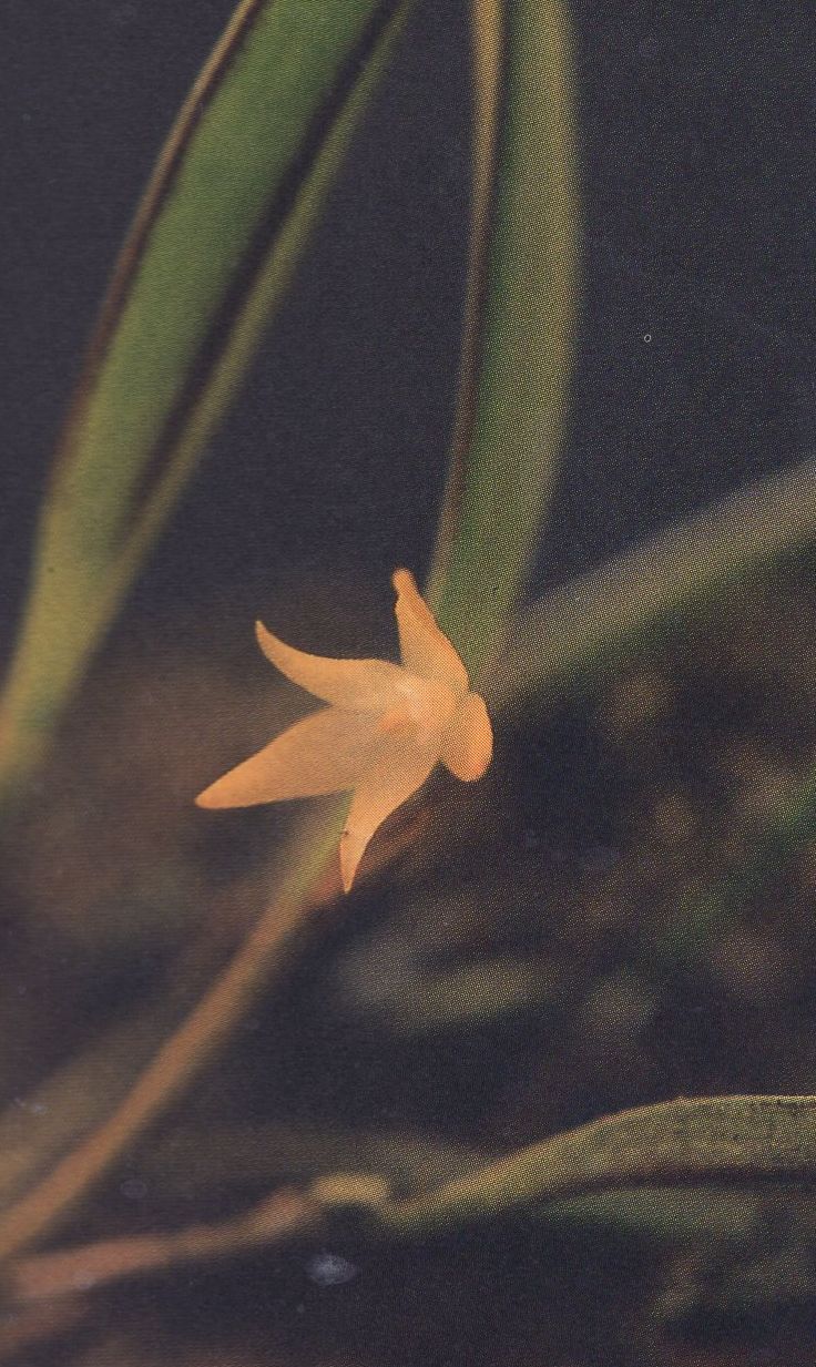Found in Colombia, Venezuela, Guyana, Fr Guiana, Surinam and northeastern Brazil at elvations around 1000 meters as a mini-miniature sized, warm to cool growing epiphyte with a short rhizome giving rise to clustered, erect to spreading, , straight to bent, glabrous stem enveloped by 3 to 4, tubular, evanescent sheaths and carrying fleshy, erct, oblong to oblong-lanceolate, acute to finely tridenticulate apically, longly attenuate into the base leaves that blooms in the later summer and fall on fasciculate, .32" [8 mm] long, single flowered inflorescence