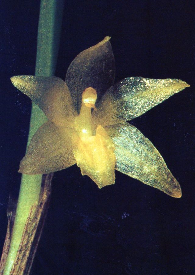 Found in Belize, Nicaragua, Costa Rica, the Leeward Islands, the Windward Islands, Trinidad & Tobago, Fr Guiana, Northern Brazil, Venezuela, Colombia and Ecuador in lower montane forests at elevations of 100 to 1400 meters as a mini-miniature to small sized, hot to cool growing epiphyte with a creeping rhizome giving rise to an erect ramicaul enveloped basallly by scarious sheaths and carrying a single, apical, erect, coriaceous, thick, carinate, acute, conspicuously apiculate, gradually narrowing below into the base leaf that blooms in the spring on an erect, single flowered inflorescence holding the faintly fragrant flower close to the leaf base.