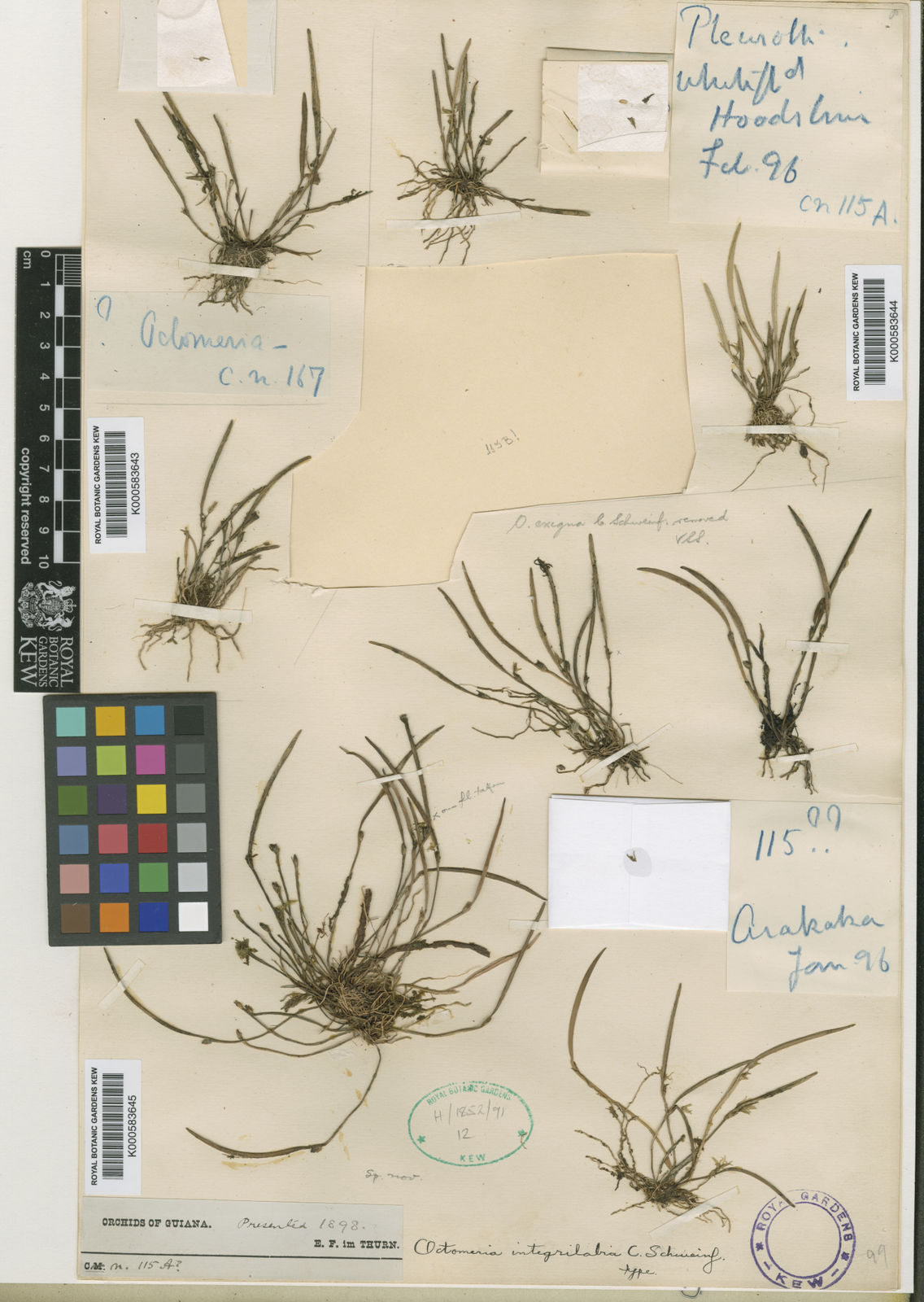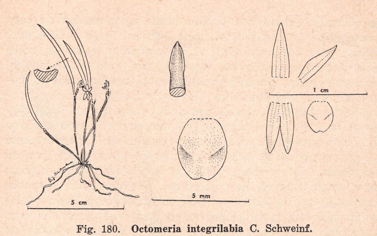 Found in Venezuela, Guyana and Roraima Brazil as well as Guadeloupe Island of the Caribbean in rain or cloud forests at elevations of 400 to 1500 meters as a miniature sized, hot to cool growing, caespitose epiphyte with thin erect ramicauls enveloped completely in youth by tubular evanescent sheaths and carrying a single, apical, linear-oblong to linear, terete to semi-terete, canaliculate, abruptly acute, shortly to inconspicuously petiolate base leaf that blooms in the spring summer and fall on 1 to a few, axillary, single flowered inflorescence with flowers that do or do not open well, sepals and petals pink to transluscent yellow, often with purplish red veins and apices and a reddish to yellow lip.