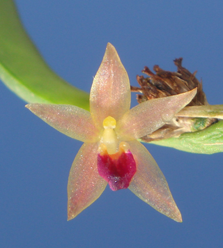 Found in Morona-Santiago and Esmeraldas provinces of Ecuador at elevations of 300 to 1000 meters as mini-miniature to miniature sized, hot to warm growing, caespitose to shortly repent epiphyte with stout, erect, terete ramicauls enveloped by 4 to 5, tubular sheaths and carrying a single, apical, erct, coriaceous, narrowly elliptical, acute to subacute, cuneate below into the pstiolet base leaf that blooms in the summer on a fascile, peduncle to .04" [1 mm] long, successively single flowered inflorescence with shorter than the ovary floral bracts and carrying flowers with light rose to yellow orange sepals and petals and a red lip.