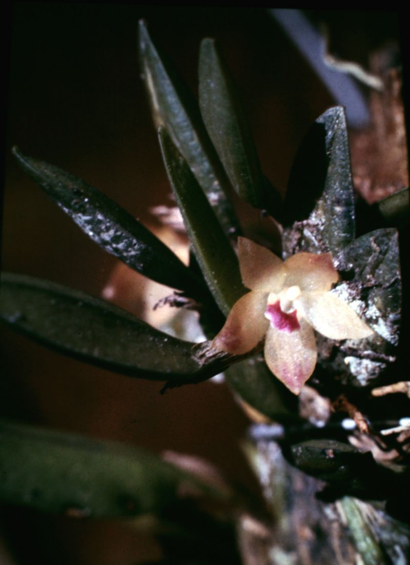 Found in Guyana and Surinam in rainforests at elevations of 300 to 600 meters as amini-miniature sized, erect to pendulous, hot to warm growing, caespitose epiphyte with a thin stem enveloped by a basal sheath and another above and carrying a single apical, erect, dull dark green, fleshy leaves that blooms in the fall on a 1 to 2 flowered inflorescence enveloped by a few bracts and arising from the base of the leaf.