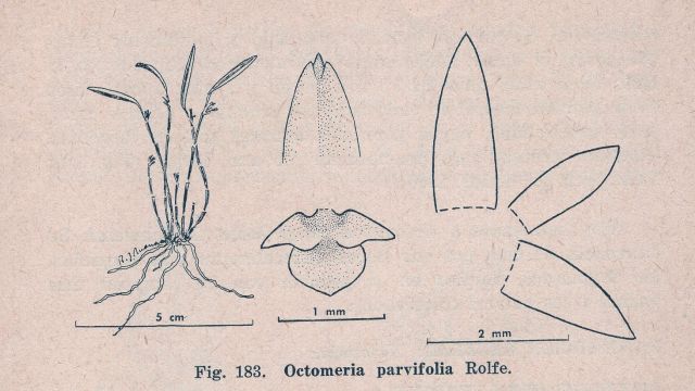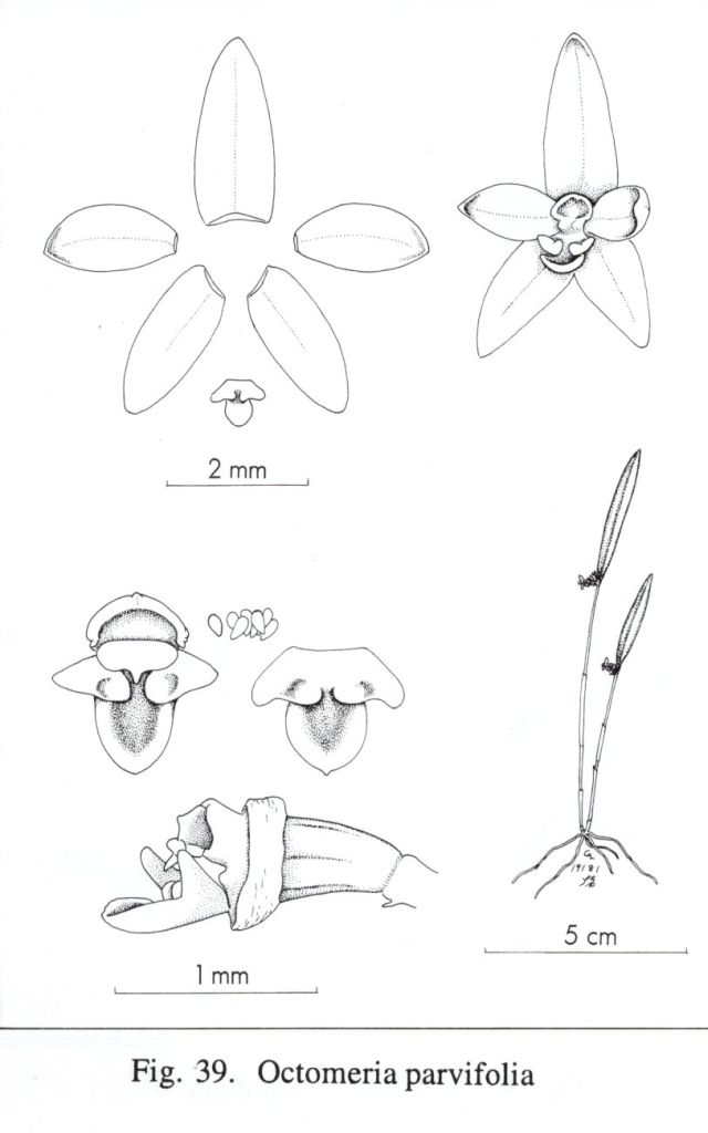 "Similar to O exigua, O integrilabia, O minor, O nana, and O parvula but O parvifolia differs in the sepals and petals being obtuse and single veined and the anterior lobe of the distinct, three lobed lip is rounded and concave while the lateral lobes below the middle are erect and obtusely triangular. A transverse, bitumid callus extends across the disc between the bases of the lateral lobes." Luer 2010