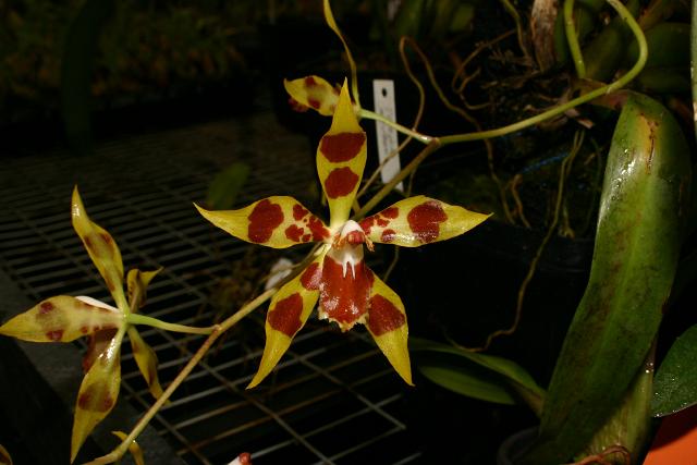 Found in Ecuador and Peru on moss covered trees in very wet lower level cloud forests at elevations of 1100 to 3100 meters as a small sized, cool to cold growing epiphyte with ovate, laterally complanate, ancipitous pseudobulbs with age becoming rugose and ridged longitudinally and enveloped basally by 6 to 9 distichous, imbricating, lower leafless, upper leaf-bearing sheaths and carrying 2, apical, elliptic to obovate, acute to acuminate leaves that taper below into a conduplicate petiole-like base and blooms in the late spring and summer on an axillary, arising on a newly matured pseudobulb, from the uppermost sheaths, erect then arching to pendulous, flexuous raceme, may have a few short, basal branches, 8 to 20" [20 to 50 cm] long, loosely 4 to 12 flowered inflorescence with appressed, scale-like, shotrer than the ovary floral bracts and carrying stellate, sometimes sweetly lemon scented flowers.