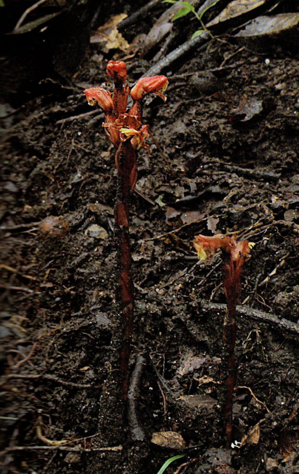 Found in Assam India, the eastern Himalayas, Nepal and Bhutan in dense mixed jungle at elevations around 3000 meters as a miniature to small sized, cold growing, leafless at blooming terrestrial with an erect, red, pilose stem enveloped by many annular, basally slacping, hyaline, expanding and broadening up the stem, that blooms in the late summer and early fall on an erect, rachis to 2.8" [7 cm] long, densely many flowered inflorescence with elliptic-ovate, concave, acute, dorsally keeled, longer than the ovary floral bracts