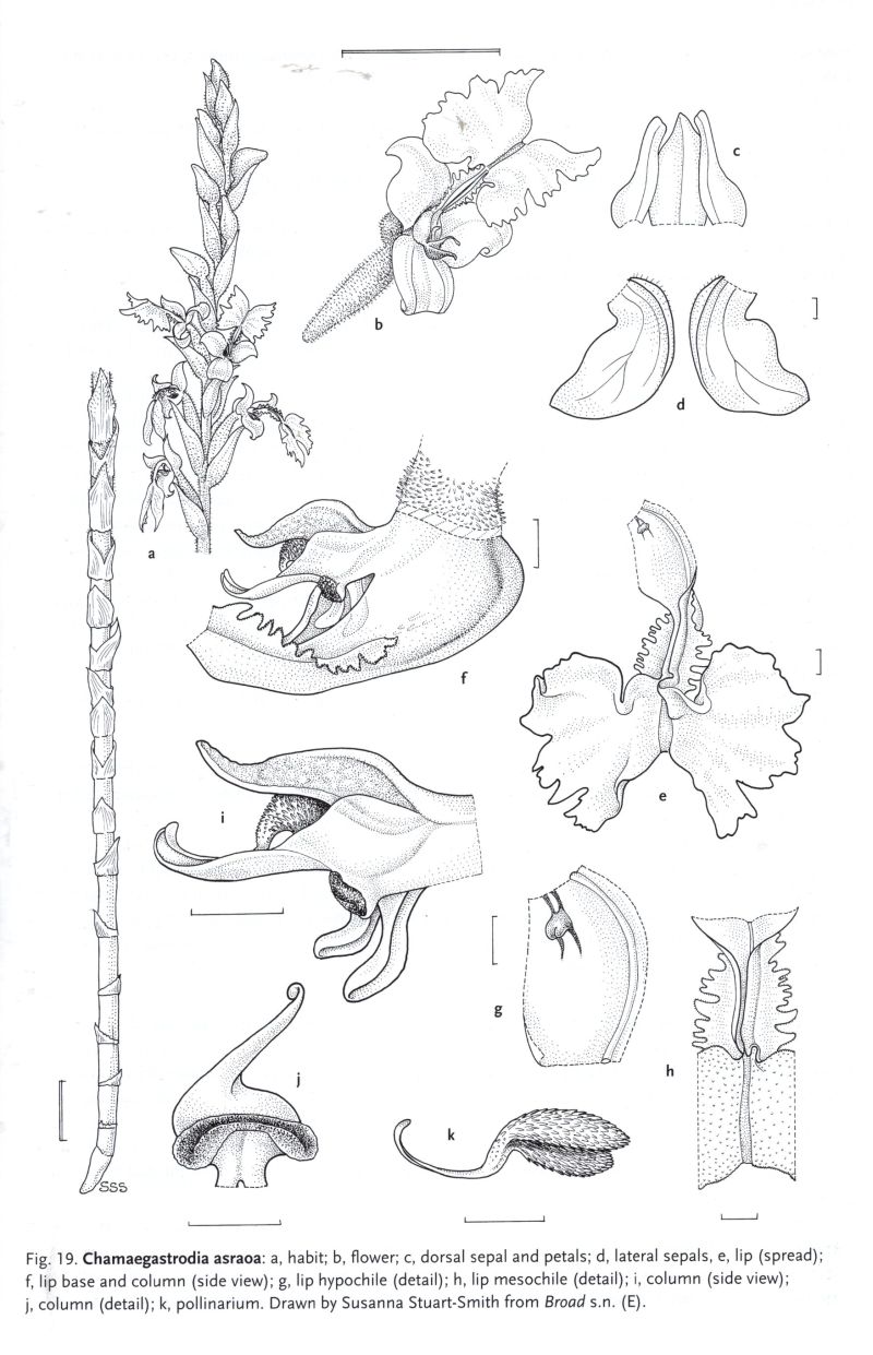 References W3 Tropicos, Kew Monocot list , IPNI ; Orchids of Bhutan Pearce & Cribb 2002 as Chamaegastrodia asraoa drawing fide; AOS Bulletin Vol 82 #3 2013 photo fide;
