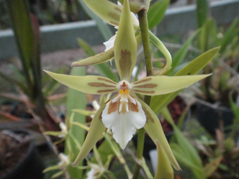 Found in Ecuador and Peru in seasonally wet cloud forests at elevations of 2400 to 3000 meters as a small sized, cold growing epiphyte or terrestrial with clustered, ovate to pear-shaped, compressed, ancipitous, rugose and longitudinally ridged with maturity pseudobulbs enveloped basally by several distichous, imbricating, leafless below and leaf-bearing above sheaths carrying 2, apical, linear to lanceolate, obtuse, strongly keeled below, channeled along the midvein above and conduplicate to form a petiole-like base leaves that blooms in the late spring and early summer on an axillary, arising on a recently matured pseudobulb, arching to subpendent, paniculate, with the few branches held to the apical half, to 36" [45 cm] long, 12 to many flowered, paniculate inflorescence with appressed, scale-like, shorter to as long as the ovary flroral bracts and carrying stellate flowers.