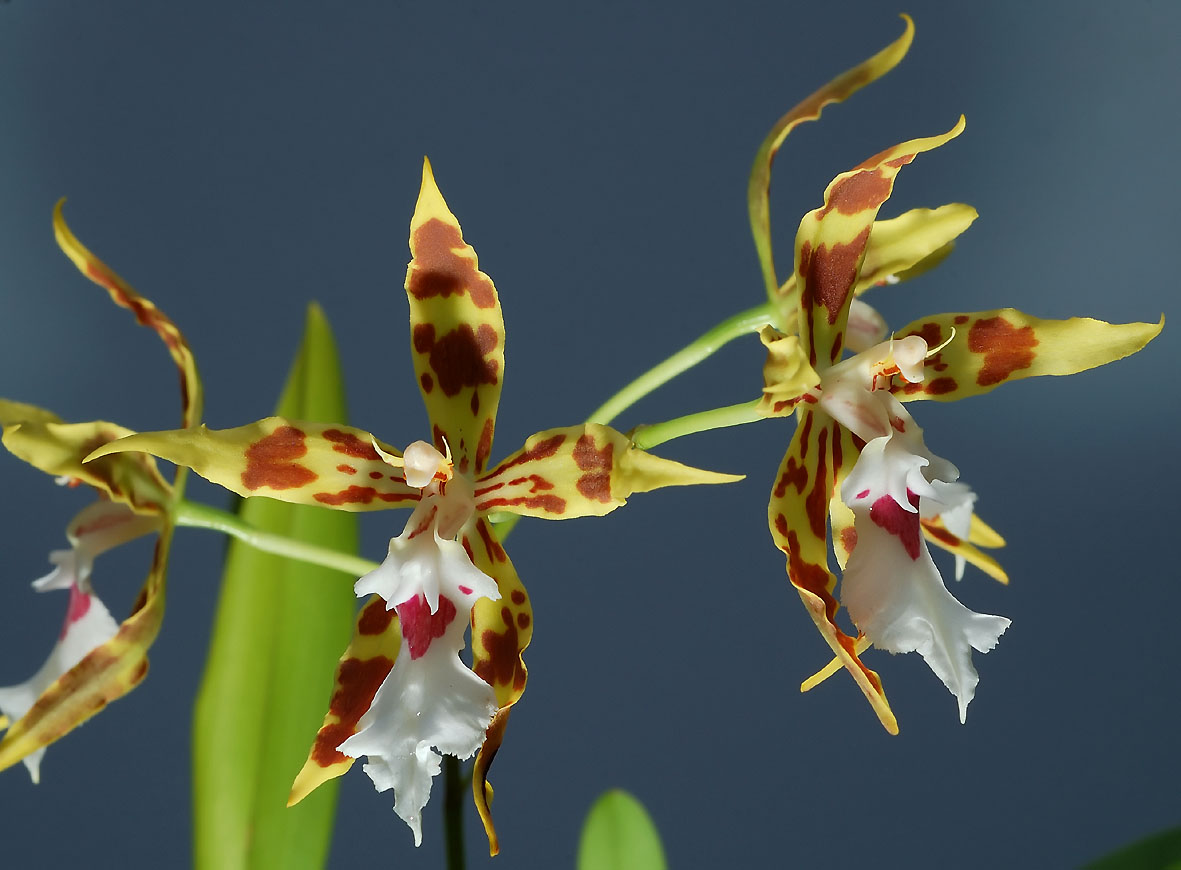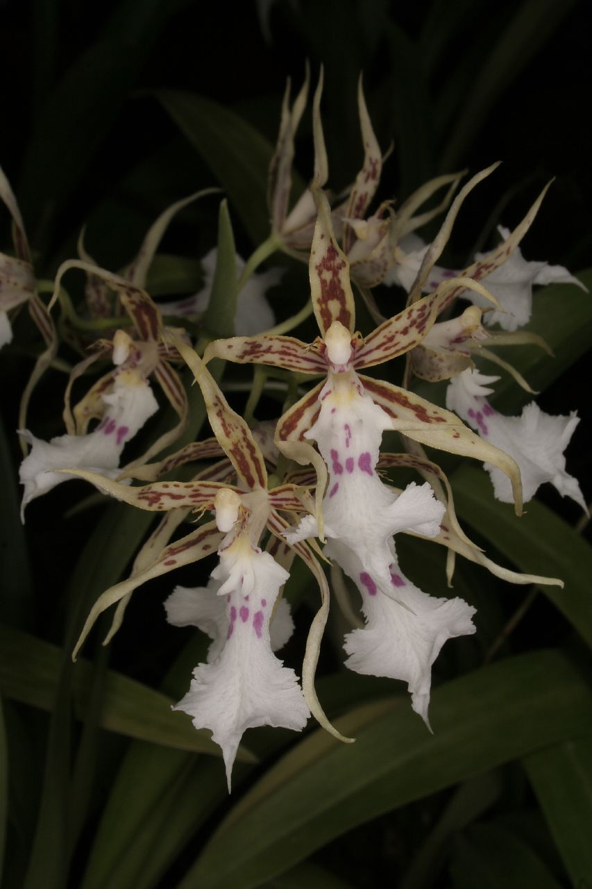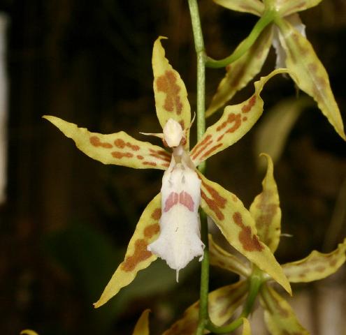 Found in Venezuela, Colombia and Ecuador at elevations of 1800 to 2300 meters as a medium sized, cool to cold growing epiphytic species with ovoid, ancipitous, light green pseudobulbs bsally enveloped by 6 to 7 distichous,, uppermost foliaceous sheaths and carrying 1 to 2, apical, elliptic to obovate, subacute or acute, conduplicate below into the subpetiolate base leaves that blooms in the fall, winter and spring on an axillary, suberect to subpendent, 20" [50 cm] long at largest, straight to weakly flexuous, racemose or paniculate with a few weakly flexuous, 2 to 3 flowered branches, many flowered inflorescence arising from a mature pseudobulb's leaf bearing sheaths that has ovate-triangular, acute bracts and carries fragrant, stellate to slightly campanulate flowers.