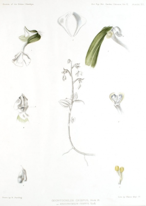 References W3 Tropicos, Kew Monocot list , IPNI ; Icones 22 Hooker 1893 drawing fide; The Orchids of Sikkim-Himalaya Part 1 King & Pantling 1898 drawing fide; Die Orchideen Schlechter 1915; Encyclopedia of Cultivated Orchids Hawkes 1965; Die Orchideen 3 Auflage Bd 1 Sonderabdruck aus Schlechter Lieferung 5 257 - 320 Brieger, Maatsch and Senghas 1974 as Anoectochilus crispus; Indian Orchids, Guide to Identification and Culture Pradhan 1976 as Anoectochilus crispus drawing fide; Orchid Digest Vol 58 #3 1994 drawings fide; Orchids of Bhutan Pearce & Cribb 2002 drawing fide; Flora of China Vol 25 Orchidaceae Zhengyi, Raven and Duyuan 2009; Flora of China Vol 25 Orchidaceae Illustrations Zhengyi, Raven and Duyuan 2010 drawing fide; A review on Spiranthoideae genera in Arunachal Pradesh Bulletin of Arunachal Forest Research 27 (1&2) : 1-33, Rao 2011