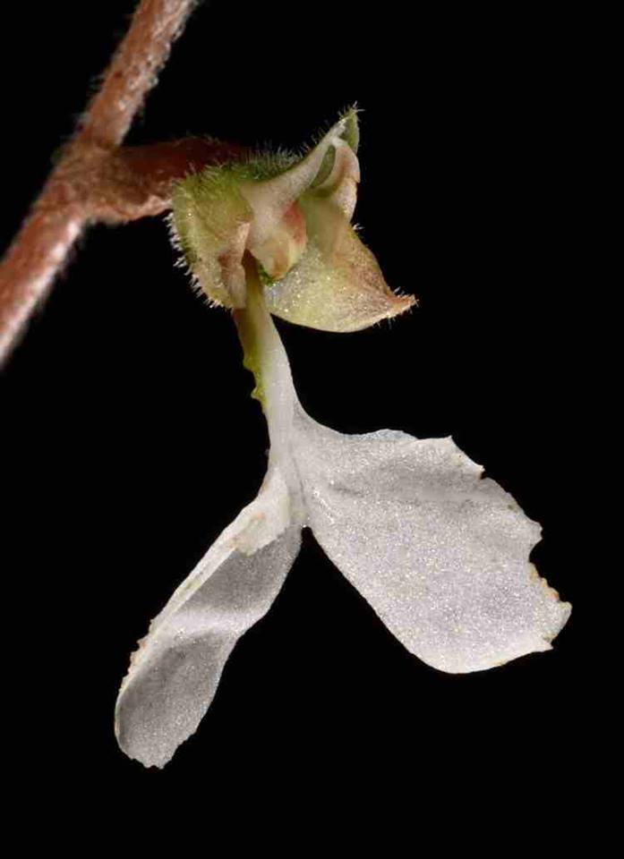 Found in the Chinese Himalayas, Assam, the eastern Himalayas, Nepal and Myanmar in open oak forests, shady secondary forests and in Bamboo forests at elevations around 360 to 2400 meters as a miniature to small sized, warm to cold growing terrestrial with a decumbent, slender stem carrying 2 to 4, at the apex of the stem, ovate, acute, minutely undialte margins, narrowing below into the dialated petiolate base leaves that blooms in the later summer and earlier fall on a pubescent, provided with 1 to 2, lanceolate, acuminate, pubescent bractsshorter than the stem, 2.2" to 3.6" [5.5 to 9 cm] long, 4 to 8 flowered inflorescence and purplish, lanceolate, outer sufrface pubescent, acuminate, nearly as long as the ovary floral bracts.