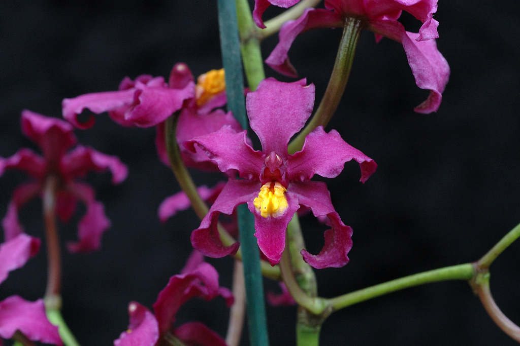 Found in Colombia and Ecuador as a medium sized, cold growing epiphyte at elevations around 2300 to 2700 meters with ovoid-pyriform, ancipitous pseudobulbs enveloped basally by several pairs of distichous, imbricating, leaf-bearing sheaths and carrying 2 apical, ligulate, subcoriaceous, acute, conduplicate beow leaves that blooms in the spring and summer on a usually erect, dull crimson below, pale green above, many branched, rebranching, somewhat vine-like, to 3 to 4' [90 to 120 cm] long, many flowered inflorescence carrying fragrant, showy flowers.