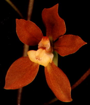 Found in Colombia, Ecuador and Peru in very wet montane forests at elevations of 2400 to 3200 meters as a miniature sized, cold growing semi terrestrial with black sooty green appearing, tightly clustered, ovoid, compressed, smooth pseudobulbs enveloped basally by a pair of foliaceous sheaths and carrying a single apical, elliptical, basally conduplicate leaf and blooms in the fall on an erect, arching to subpendent, to 12 to 40" [30 to 100 cm] long overall, paniculate, distantly branched, straight to fractiflex, branches to 4" [10 cm] long, each 4 to 10 flowered, few to many flowered inflorescence with adpressed, scale-like floral bracts and carrying slightly campanulate flowers arising from the basal leaf sheath of a mature pseudobulb.