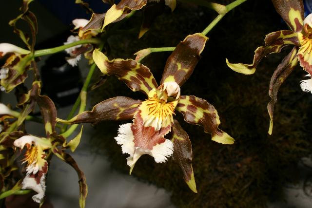 Found in Colombia, Ecuador and Peru on small trees or terrestrial in leaf litter in very wet montane cloud forests at altitudes of 1200 to 3000 meters and is a medium sized, cold to cool growing epiphyte with clustered, oblong-ovoid to ovoid, compressed, ancipitous pseudobulbs enveloped basally by 2 to 4, distichous, leaf bearing sheaths and carrying 1 or 2 apical, oblong-lanceolate to ligulate, acute leaves that are conduplicate below into a petiole-like stem that blooms in the spring and summer on an basal, arising on a mature pseudobulb through the uppermost leaf axils, erect to arcuate, to 2' [60 cm] long, racemose or rarely paniculate, 4 to 20 flowered inflorescence with large, variably colored, distincly scented, stellate to slightly campanulate flowers.