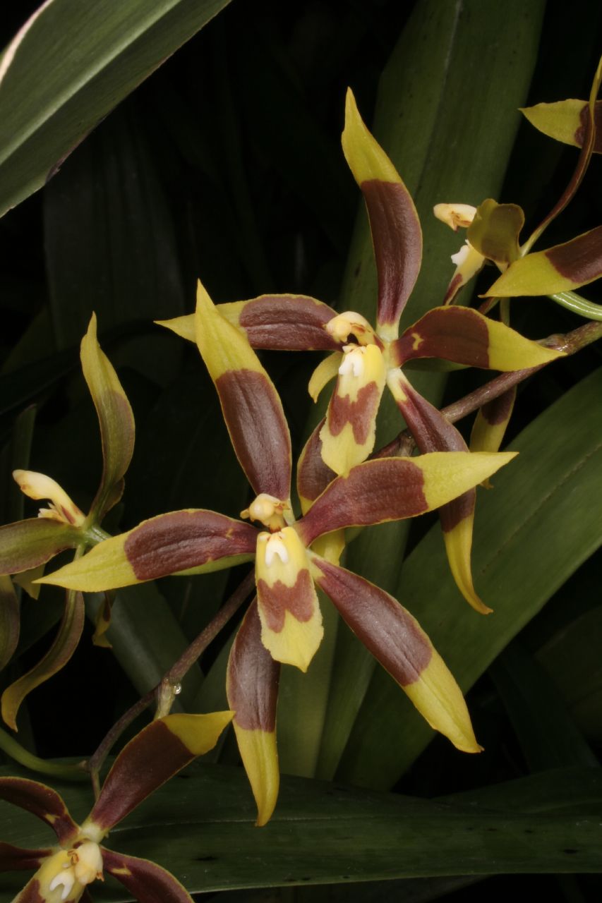 Found in Peru and Ecuador in wet montane forests on moss covered branches of trees at elevations of 1600 to 3200 meters as a small sized, cold to cool growing epiphyte with clustered, ovoid, rugose, complanate pseudobulbs enveloped basally by 5 to 7 pairs of distichous, imbricating sheaths with the uppermost being foliaceous and carrying 2 apical, oblanceolate, acute leaves that taper to a conduplicate, carinate petiole and blooms in the fall on an axillary, arising on a mature pseudobulb, terete, erect to arching, racemose, 14" [35 cm] long, several [8 to 10] flowered inflorescence with appressed, scale-like, shorter than the ovary flora lbracts and carrying stellate to rather campanulate flowers.