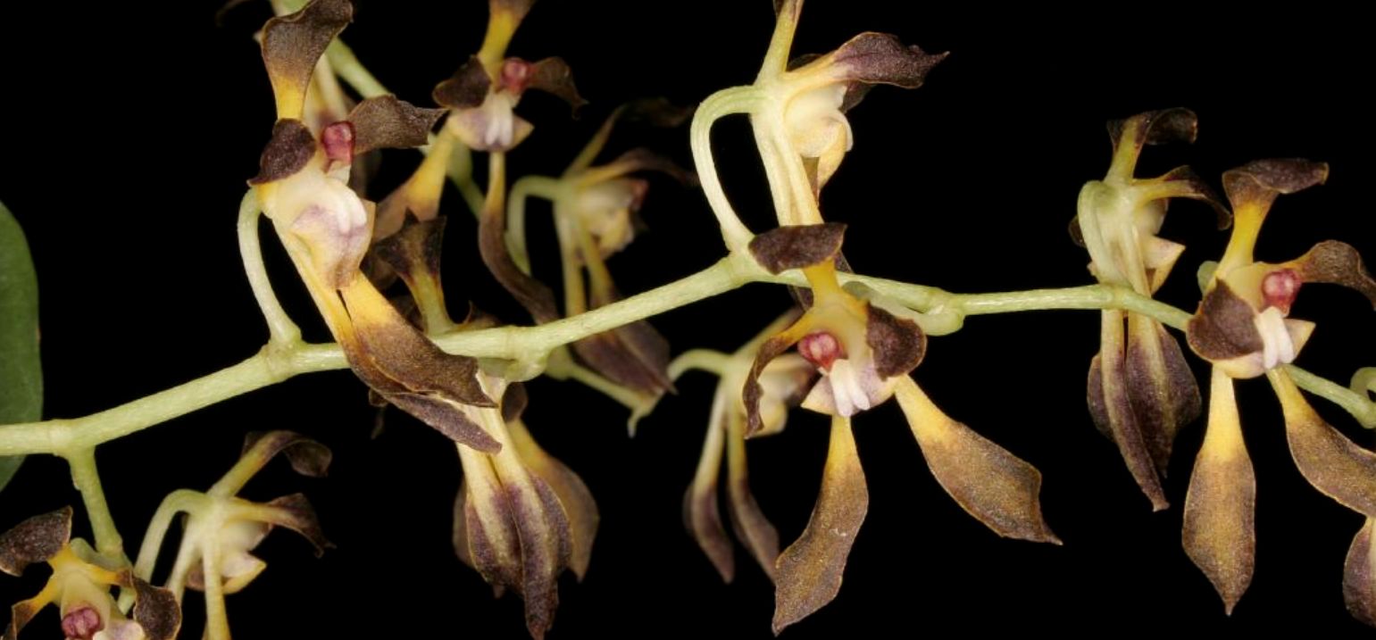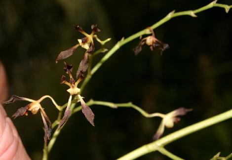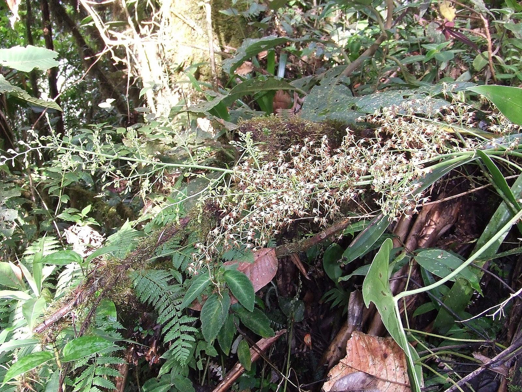 Found in Colombia, Ecuador and Peru in upper montane cloud forests at elevations of 1450 to 3300 as a large sized, cool to cold growing epiphyte or terrestrial on steep embankments with cylindrical, flattened, elongate pseudobulbs completely enveloped basally by imbricating, distichous sheaths with the uppermost being leaf-bearing and carrying a single, apical, linear-lanceolate, conduplicate towards the base leaf and blooming at any time of the year on an axillary, slender, erect to arching, 3' [90 cm] long, shortly pedunculate, paniculate, widely spaced, shortly branched, horizontal, often rebranching, rebranch fractiflex, densely multi-flowered inflorescence arising on a mature pseudobulb through the axil of a basal sheath and carrying very small flowers.