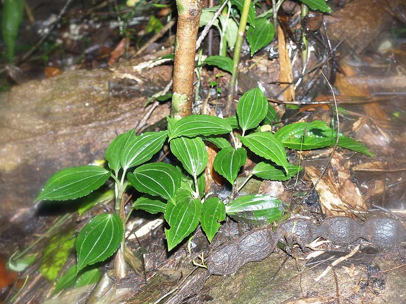 Found in the Chinese Himalayas, Assam, the eastern Himalayas, Myanmar, Thailand, Vietnam and Malaysia in evergreen hill forests in deep shade at elevations of 750 to 1560 meters as a miniature to small sized, warm to cool growing terrestrial with a decumbent, stout stem carrying 4 to 8, scattered along the stem, green above, paler light green beneath 3 veined, ovate-lanceolate, acute to acuminate, sometimes mucronate, slightly oblique, narrowing below into the channeled, petiolate base leaves that blooms in the later spring through summer on a pubescent, erect, to 4" [10 cm] long, 3 to 6 flowered inflorescence with a single, acuminate, pubescent bracts and lanceolate, acumiante, thinly pubescent floral bracts.
