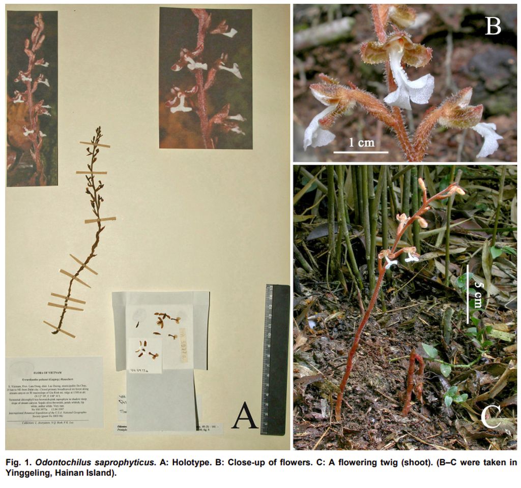 Photos by © Averyanov, Huai-Zhen Tian, Zhi-Quan Cheng, Ai-Qun Hu, Avishek Bhattacharjee and Qiao-Xia Liu courtesy of *A New Synonym of Odontochilus saprophyticus (Goodyerinae: Orchidoideae: Orchidaceae Huai-Zhen Tian, Zhi-Quan Cheng, Ai-Qun Hu, Avishek Bhattacharjee and Qiao-Xia Liu 2014