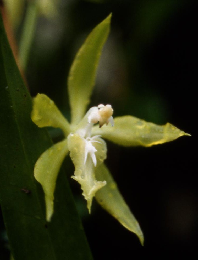 Found in Peru and Bolivia in upper elevation seasonally very wet, cloud forests at elevations around 2300 to 3000 meters as a small to just large sized, cold growing epiphyte with caespitose, ovoid, ancipitous, slightly compressed pseudobulbs enveloped basally by 6 to 8 distichous, uppermoat foliaceous sheaths and carrying narrow, apically acute, conduplicate belo intothe base leaves that blooms in the summer and fall on an axillary, provided with 4+, short, widely spaced, close, tubular sheaths, shortly racemose, to more than 14" [35 cm] long, 2 to 3 flowered, racemose inflorescence with appressed, scale-like, much shorter than the ovary floral bracts and carrying stellate to having the tepals back bent on the flowers
