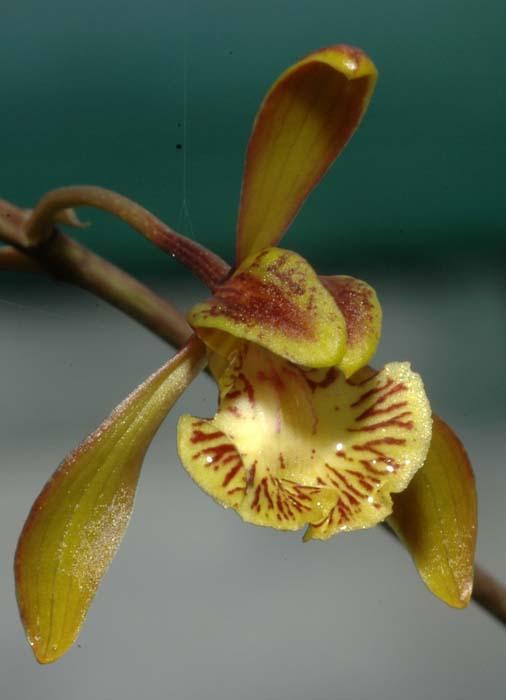 Found in western Madagascar in dry moss and lichen forest with sandy or rocky soils at elevations of 1000 to 1200 meters as a large sized, cool growing terrestrial with green, conical, 5-angled, bare pseudobulbs carrying 5 to 9, widely linear, thick, coriaceous, very unequally bilobed apically, dark green with white mottled leaves that blooms in the late spring, summer and fall on an axillary, peduncle provided with 7 to 8 short, appressed basal sheaths, longer and more distant above, bicomposite, 3' to 3.5' [1.2 m to 1.5 m] long, loose, 20 to 40 flowered inflorescence with much shorter than the pedicel floral bracts .