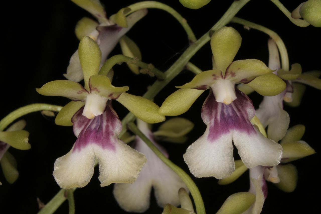 Found in eastern Madagascar in dry woods as a small sized, warm growing terrestrial with conical, 6 to 7 angled pseudobulbs enveloped by 3 caudaceous sheaths and carrying a single, persistent, longly petiolate, medially articulate, narrowly lanceolate, attenuate-acute at both ends, finely veined leaf that blooms in the late spring and summer on an erect, arising before the new growth, 16" to 20" [40 to 50 cm] long, paniculate, 7 to 10 flowered inflorescence with 4 scarious, obtuse, finely veined bracts.