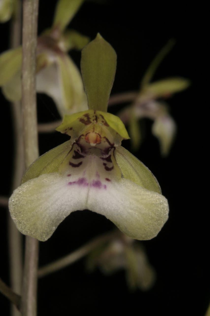 Found in Tanzania, Mozambique, Natal South Africa and the Comoros Islands in coastal forests at elevations of sealevel to 500 meters as a medium sized warm growing terrestrial with close-set narrowly conical to ovoid, dark green pseudobulbs carrying a single, apical, erect, stiff, ovate to oblong-lanceolate, acute, undulate to finely crenulate margins, green, gradually narrowing below into the elongate, wiry petiolate base leaf that blooms in the early summer on 1 to 2, erect, 12 to 18.8" [30 to 47 cm] long, simple to 1 to 2 branched, 20 to 30 flowered inflorescence enveloped by 3 to 4 bracts.