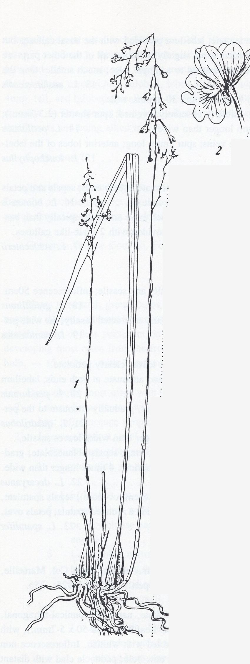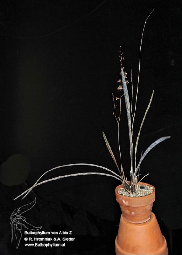 Found in Mozambique and Madagascar in dryish coastal forests on sandy soils at elevations around 60 meters as a medium sized, hot growing terrestrial with narrowly conical, somewhat 4 angled, ribbed pseudobulbs carrying a single, apical, narrowly linear, whitish green mottled with dark green, tapering gradually below into the petiolate base leaf that blooms in the late spring on an erect, to 20" [50 cm] long, simple or with 1 to 2, short, branches, many flowered inflorescence.