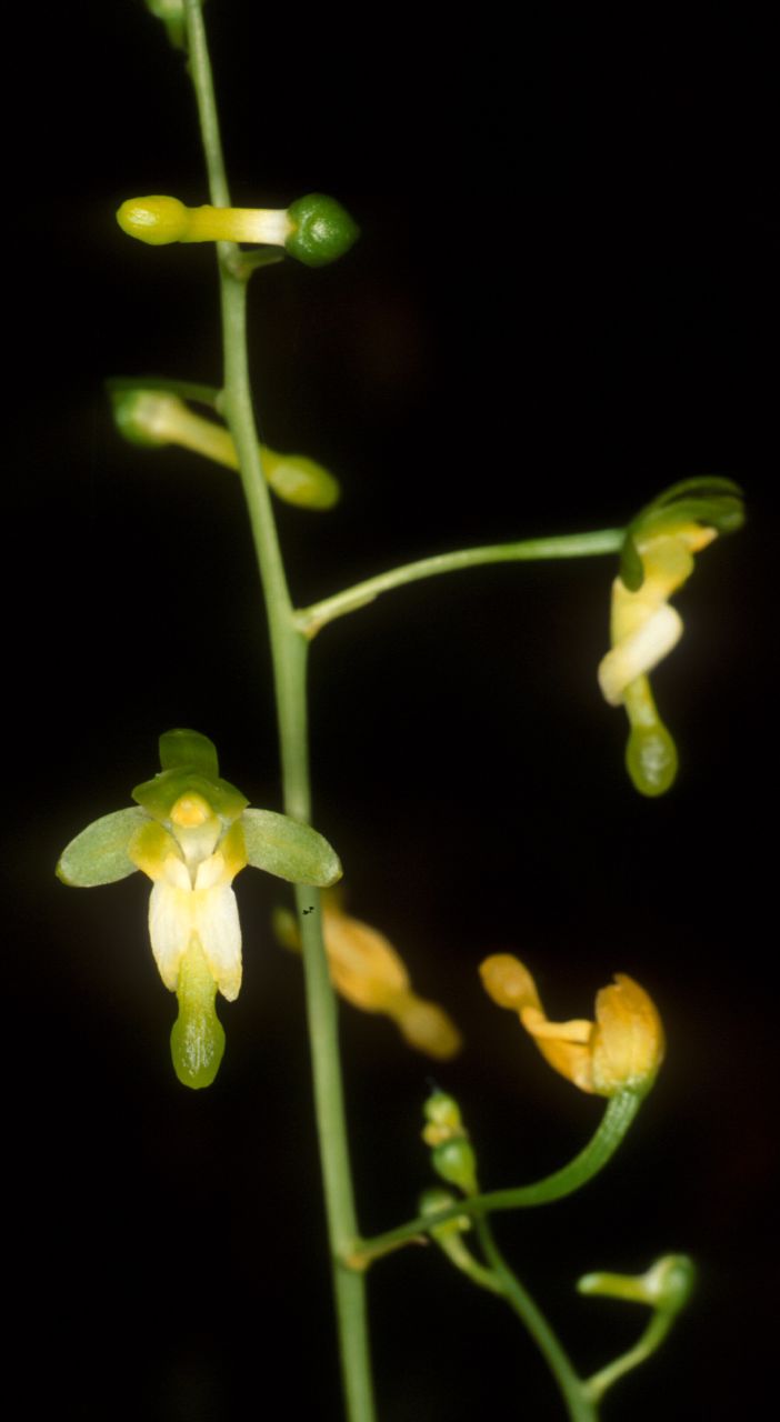 Found in Zimbabwe, Swaziland and Madagascar at elevations of 100 to 500 meters as a medium sized, warm growing terrestrial in sandy tropical forests away from the sea with cylidrical-conical, closely adpressed to the rhizome pseudobulbs carrying 2, apical, oblanceolate-linear, apiculate, gradually attenuate from the petiolate base leaves that blooms in the late spring and summer on a basal, racemose, 14" [35 cm] long, loosely 8 to 12 flowered inflorescence arising on a mature pseudobulb