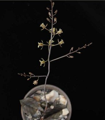 Found in southwestern Madagascar in forest undergrowth in evergreen forests as a small to medium szied, warm to cool growing terrestrial with obovoid pseudobulbs carrying a single, ovate, acute, tessellated, gradually narrowing below into the 4" [10 cm] long, petiolate base leaf that blooms in the late spring and summer on an erect, simple to branched, to 8" [to 20 cm] lojng, several to many flowered inflorescence.