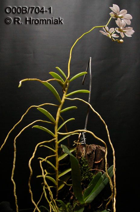 Found in the eastern coastal forests of Madagascar at elevations of sealevel to 1500 meters as a small to medium sized, hot to cool growing epiphyte with an elongate stem carrying sparse, distant, oval-oblong or elliptical leaves that are somewhat attenuate to the sheath that blooms in the summer, fall and early winter on a 12 to 14" [30 to 35 cm] long, loosely many flowered inflorescence.