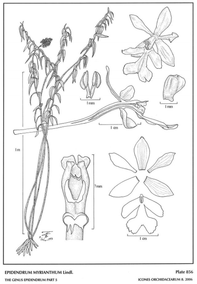 References W3 Tropicos, Kew Monocot list , IPNI ; Die Orchideen Schlechter 1915 as Epidendrum myrianthum; Atlas des Orchidees Cultivees Constantin 1920 drawing fide; The Genus Epidendrum Ames 1936; AOS Bulletin Vol 27 No 9 1958 drawing ok; Encyclopedia of Cultivated Orchids Hawkes 1965 as Epidendrum verrucosum var myrianthum; Las Orquedias De El Salvador Vol 1 Hamer 1974 drawing/photo fide; Orquídea (Mexico City). 8(1): 3 1981 as Oerstedella myriatha drawing fide; Las Orquedias de El Salvador Vol 3 Hamer 1981 as Oerstedella myriantha drawing fide; Orchids of Mexico Hagsater, Soto, Salazar, Jimenez, Lopez and Dressler 2005 photo fide; Icones Orchidacearum 8 Plate 815 Hagsater and Sanchez 2006 see recognition section; Icones Orchidacearum Vol 8 Plate 852 Hagsater & Sanchez 2006 see recognition section; Icones Orchidacearum 8 Plate 856 Hagsater 2006 as drawing fide; Icones Orchidacearum 8 Plate 897 Hagsater 2006 see recognition section Icones Orchidacearum 13 Plate 1301 Hagsater 2010 see recognition section; Orchid Genera and Species in Guatemala Archila, Szlachchetko, Chiron, Lipinska, Mystkowska and Bertolini 2018