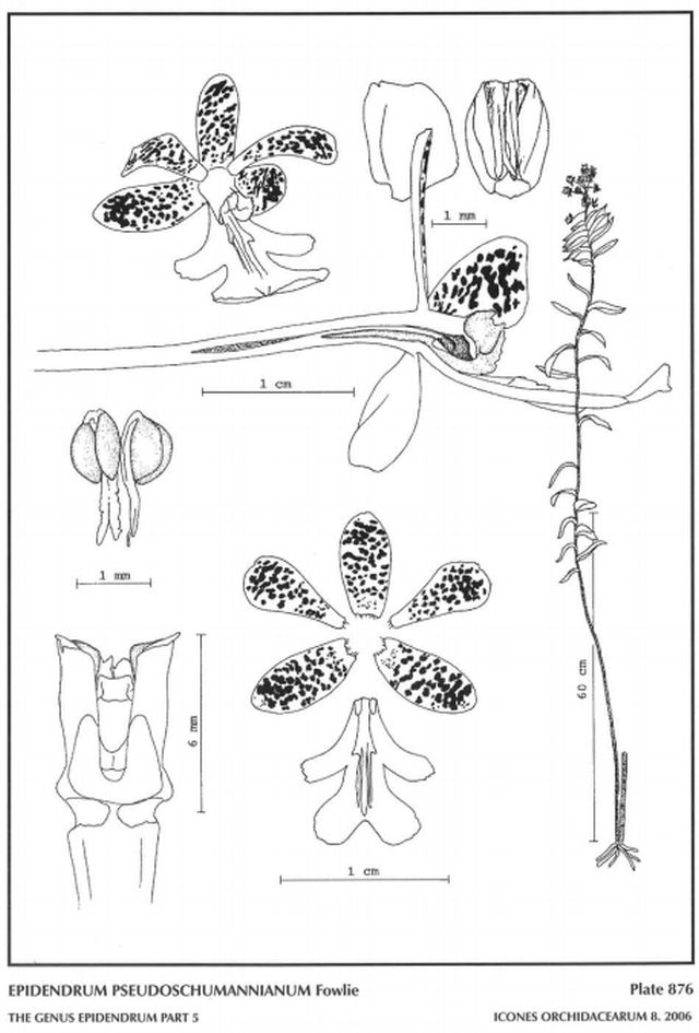References W3 Tropicos, Kew Monocot list , IPNI ; Orchid Digest Vol 38 No 1 1974 as Epidendrum pseudo-schumanianum photo fide; Orchids Travel By Air A Pictoral Safari Mulder, Mulder-Roelfsema and Schuiteman 1990 as Oerstedella psseudoschumanniana photo fide; Icones Orchidacearum 8 Plate 871 Hagsater 2006 see recognition; Icones Orchidacearum 8 Plate 887 Hagsater 2006 see recognition section; Icones Orchidacearum 8 Plate 876 Hagsater 2006 drawing fide; Icones Orchidacearum 9 Plate 983 Hagsater 2007 see recognition section; Orchids of the Department of Valle De Cauca Colombia Vol 2 Kolanowska, Hagsater etal. 2014 photo drawing/photo fide; Orquideas, Tesoro de Colombia Vol 2 Ortiz & Uribe 2017 drawing/photo fide;