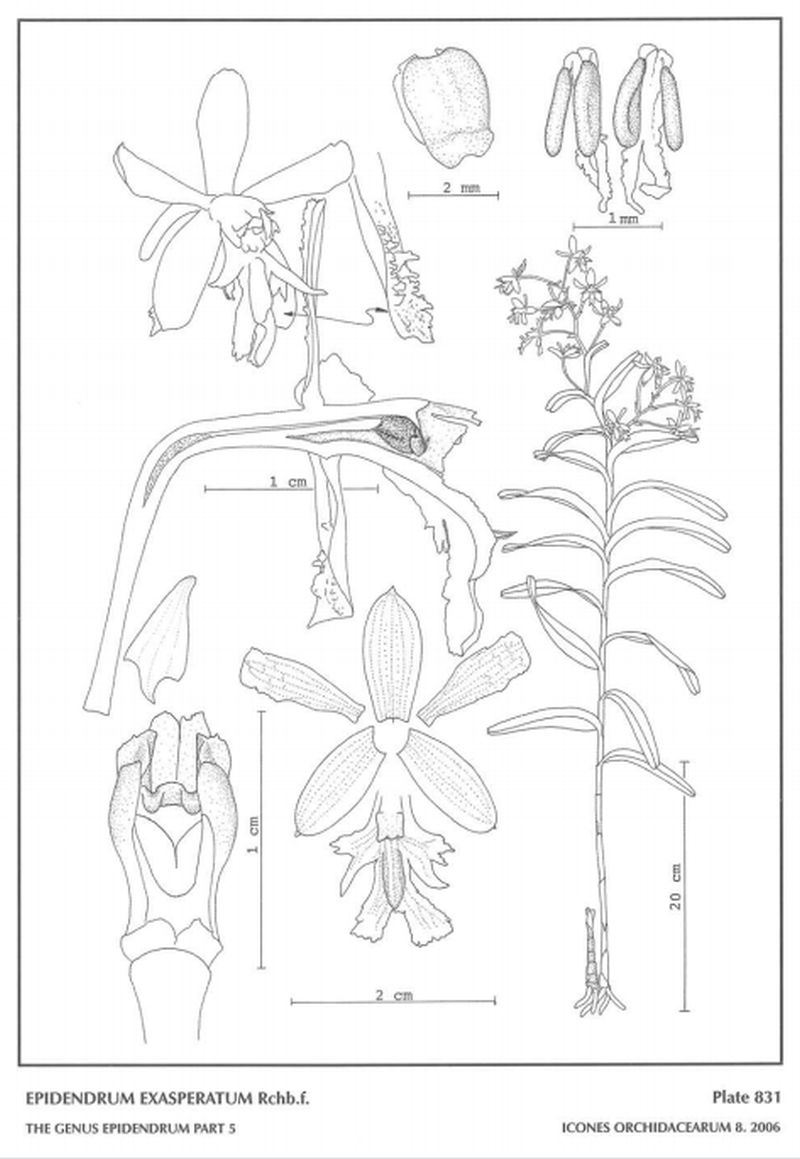 References W3 Tropicos, Kew Monocot list , IPNI ; Beitr. Orchid.-K. C. Amer. 87. 1866 ; Repert. Sp. Nov. Regni. Veg. Beih. 19: 37. Costa Rica Schlechter 1923; Repert. Sp. Nov. Regni. Veg. Beih. 19: 119. Costa Rica Schlechter 1923; Repert. Sp. Nov. Regni. Veg. Beih. 19: 212. Costa Rica Schlechter 1923; The Genus Epidendrum Ames 1936; The Orchids of Panama L.O. Williams & P Allen 1946; Ceiba Vol 5 No 1 L O Williams 1956; Orquideologia Vol 12 No 1 1977; Die Orchideen 3 Auflage Bd 1 Sonderabdruck aus Schlechter Lieferung 9 513 - 576 Brieger, Maatsch and Senghas 1977; Orchids Travel By Air A Pictoral Safari Mulder, Mulder-Roelfsema and Schuiteman 1990 as Oerstedella exasperata photo fide; Icones Planetarum Tropicarum plate 1460 Atwood 1992 as Oerstedella exasperata drawing fide; AOS Bulletin Vol 63 No 1 1994 photo fide; Manual de Plantas de Costa Rica Vol 3 Hammel, Grayum, Herrera and Zamora 2003 as Oerstedella exasperata; Icones Orchidacearum 8 Plate 811 Hagsater 2006 See recognition section; Icones Orchidacearum 8 Plate 831 Hagsater & Sanchez 2006 drawing fide; Icones Orchidacearum 8 Plate 868 Hagsater 2006 see recognition section; Icones Orchidacearum 8 Plate 869 Hagsater 2006 see recognition section; Icones Orchidacearum 9 Plate 931 Hagsater 2007 see recognition section; Icones Orchidacearum 9 Plate 993 Hagsater 2007 see recognition section; Icones Orchidacearum 11 Plate 1145 Hagsater 2008 see recognition section; Orchids of Costa Rica Vol 1 Morales 2009 photo fide; Lankesteriana 19(1). 31 - 55 2019 photo fide; Vanishing Beauty, Native Costa Rican Orchids Vol 2 Lacaena to Pteroglossa Pupulin 2020 photo fide