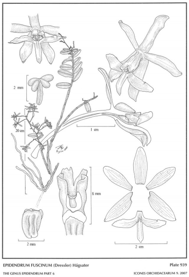 "Epldendrum fuscinum belongs to the GROUP Oerstedella which is characterized by the sympodial habit, mostly verrucose stems, and the rostellem which is perpendicular to the longitudinal axis of the column, forming a wide, open sinus and SUBGROUP Intermixtum which has small, membranaceous flowers with a petaloid, usually bifid clinandrium hood, and obovoid, laterally compressed pollinia with long, granulose caudicles. The species is recognized by the medium large, pale green flowers with sepals .52 to .6" [13 to 15 mm], with the lip, while, 3-lobed, the lateral lobes are three times longer than wide and the midlobe linear, acute, flowering in March and April. Epidendrum folsomii Hágsater is very similar but nas smaller flowers with sepals .36 to .4" [9 to 10 mm], with ochre-colored sepals and petals, the lobes of the lip narrower and flowerng from July to October. Epidendrum intermixtum Ames & C. Schweinf. has even smaller flowers with sepals .24 to .38" [6 to 8.5 mm], pale green and white flowers, with the lateral lobes of the lip only twice as long as they are wide, the midlobe oblong-ovate, minutely apiculate, and a bifid clinandrium-hood. Epidendrum chalcochronum Hágsater has longer lateral inflorescences, with the flowers very similar to those of E. intermixtum but reddish to olive-green, with an entire clinandrium." Hagsater etal 2007