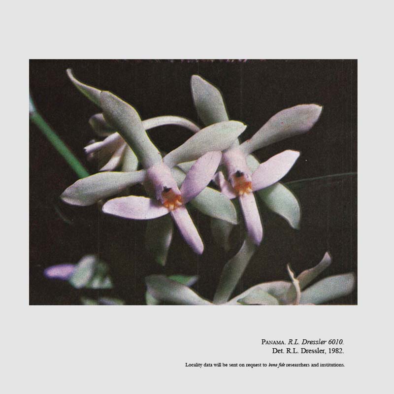 Found in Panama at elevations around 800 to 1000 meters as a miniature to medium sized, warm growing epiphyte with a simple, arising from near the base of the previous stem, cane-like, terete, thin, erect, straight stem enveloped basally by non foliaceous, verrucose, tubular sheaths and carrying 6 to 12, throughout the apical half, alternate, articulate, spreading, lower ones deciduous, ovate to ovate-elliptic, obtuse, generally bilobed leaves that blooms in the early spring on a terminal and lateral, erect, terete, thin, .8 to 3.2" [2 to 8 cm] long including the .2 to .6" [.5 to 1.5 cm] long peduncle, the laterals racemose, the apical paniculate, 12 to 17 flowered inflorescence and much shorter than the ovary, triangular-ovate, acute floral bracts.