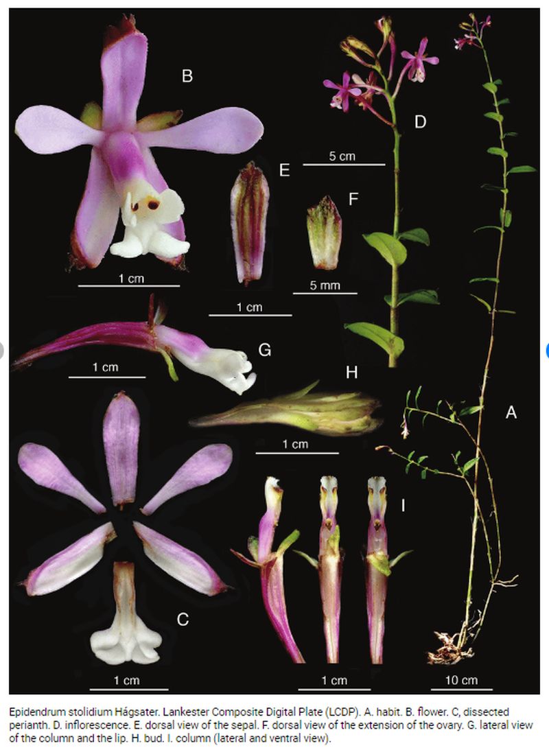 "Epidendrum stolidium belongs to the GROUP Oerstedella which is characterized by the sympodial habit, mostly verrucose stems, and the rostellum which is perpendicular to the axis of the column instead of parallel, forming a wide, open sinus, and without a viscidium, and the SUBGROUP Aberrans, which is characterized by the pink flowers, and the column with an elongate cylindrical clinandrium hood, the pollinia bird-wing type unequal and the caudicles lam inar. The species is recognized by the pink and white flowers, 3 prominent, green, three lobular appendages, alternate to the sepals which are dorsally ornamented with dentate keels; the elongate cylindrical clinandrium-hood is cream-colored and funnel-shaped at the end with a pair of comma-shaped magenta spots. The other species in the GROUP Oerstedella SUBGROUP Aberrans; E. centropetalum Rchb. f., E. pansamalae Schltr. and E. crescentilabllm Ames among them, do not have the alternate calyculum lobes behind the sepals which are dorsally glabrous. Epidendrum exasperatum Rchb. f. has smaller flowers with sepals .4 to .52" [10 to 13 mm] long, greenish brown with a white lip and the selpals are dorsally aculeate-verrucose; the short non-petaloid clinandrium-hood." Hagsater etal 2007