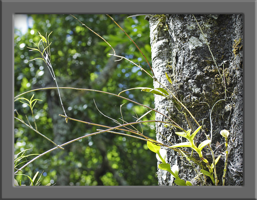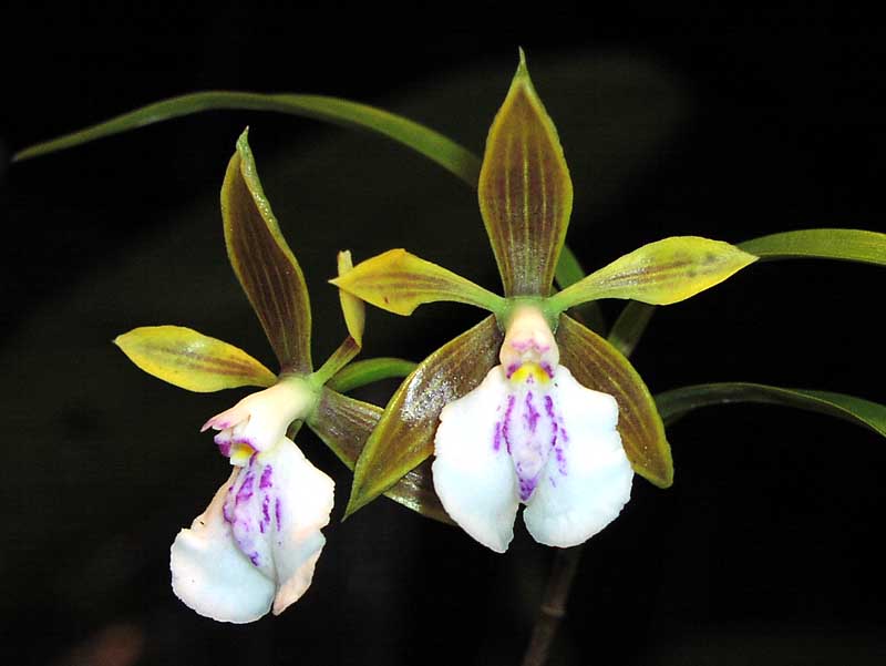 Found in Costa Rica in wet montane forests on cliffs as a small to medium sized, cool to cold growing lithophyte at elevations of 1800 to 2400 meters with erect, thin, warty canes up to 3 ft. [90 cm] long, with short apical branches on mature canes carrying in the apical 1/2, narrow 2" leaves, producing new basal growths as well as many branching keikis which also flower. The 10 to 19 flowers appear simultaneously in each cluster arising at the tips of all the canes, with long-lasting, very beautiful, 1" {2.5 cm], flowers occuring in the summer.