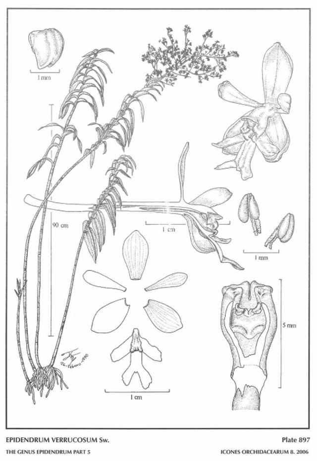 "Epidendrum verrucosum belongs to the GROUP Oerstedella which is characterized by the sympodial habit, mostly verrucose stems, and the rostellum which is perpendicular to the axis of the column instead of parallel forming a wide, open sinus and without a viscidium, and the SUBGROUP Verrucosum recognized by the small to medium sized, membranaceous flowers with sepals and petals immaculate, a bilobed clinandrium-hood slightly surpassing the body of the column, obovoid, subequal pollinia with long granulose caudicles. The species is recognized by the tall plants to 10' [up to 3 m] long, paniculate inflorescence with numerous white flowers, the callus yellow, or sepals and petals white or greenish cream and the lip creamy-yellow, the lobes of the lip similar, rectangular-oblong, inserted at about 45°. It is similar to E. myrianthum Lindl. Which has somewhat smaller plants to 6' [1.8 m], similar but lilac-colored flowers. Epidendrum macdougallii (Hágsater) Hágsater has short, thin-stemmed plants to 3' [90 cm] tall) with a generally racemose inflorescence, the peduncle with several bracts, and lilac pink flowers." Hagsater etal 2006
