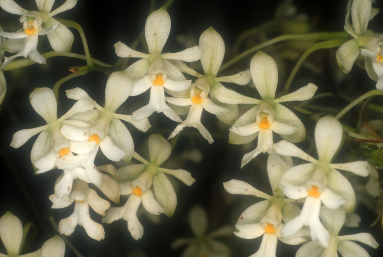 Found from southern Mexico south to Nicaragua as well as Cuba and Jammaica in lower montane rainforests at elevations of 600 to 2600 meters as a miniature sized, warm to cold growing epiphyte, lithophyte or terrestrial with rigid, simple, cane-like, terete, thin but robust stems enveloped by warty, leafless sheaths below and carrying 13 to 30+ on the apical half, distichous, articulate, erect-spreading, lanceolate to linear-lanceolate, acuminate apically leaves that blooms in the late spring through fall on a terminal, without a spathe, occuring only once, peduncle terete, delgado to robust, straight, .8 to 2" [2 to 5 cm} long, paniculate, rarely racemose, erect, 4 to 16" {10 to 40 cm] long, slightly flexuous rachis, simultaneously 20 to 500 flowered inflorescence with lanceolate, acuminate, gradually shorter floral bracts and carrying resupinate flowers that are without fragrance except in Jamaica where they are scented.