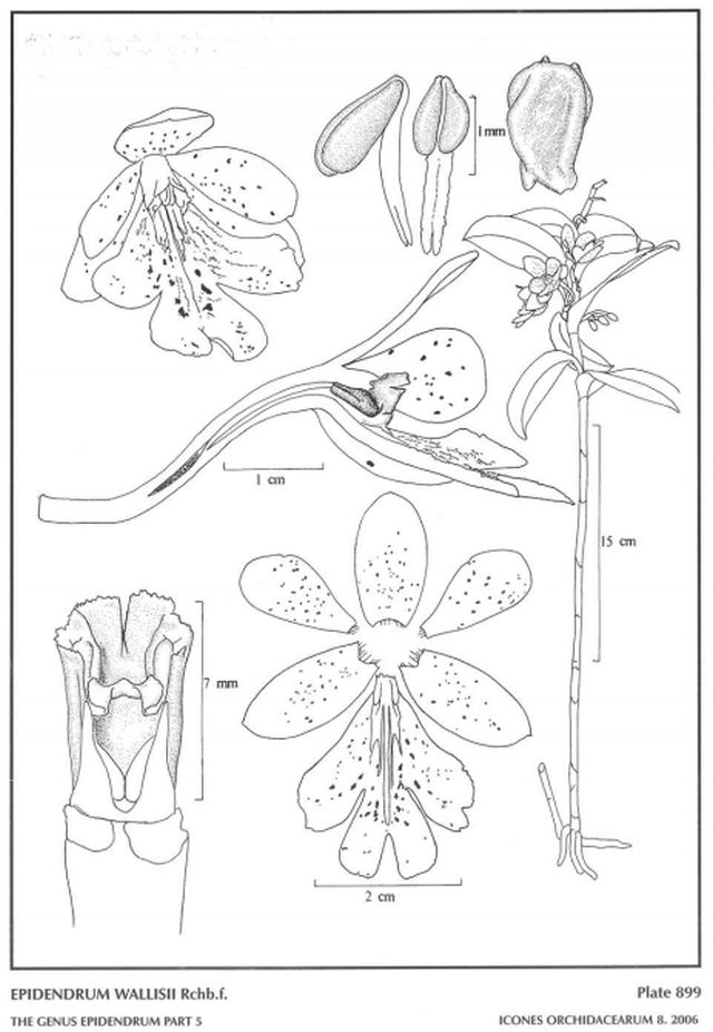 "Epidendrum wallisii belongs to the GROUP Oerstedella SUBGROUP Wallisii. The species is recognized by the larger fleshy, very showy flowers, sepals and petals yellow,generally with dark purple dots, the lip white turning yellow, with purple lines, or dark purple dots. Epidendrum pinniferum C Schweinf. has somewhat smaller flowers with sepals .6 to .68" [15 to 17 mm], reflexed sepals and petals, generally yellowish brown with more intense brown markings on the sepals, the lip is lilac-pink with multiple thickened veins; an albino form exists in Panama, with yellow and white flowers. Epidendrum lacteum Dressler has small plants, greenish creamy, immaculate sepals and petals, with a white lip and is apparently endemic to central Panama in the provincce of Veraguas. NOTE: The basis for the separation of E. pseudowallisii were slight differences in the wider petals and smaller, narrower lip, and the lack of keels on the lip. Withner stated that the Costa Rica flowers had a white lip, while those from Colombia haa prominent purple lines on the disc. Dressler (pers. comm.) has said that the variation he has seen in Colombia or Panama is much larger than between the flowers from Costa Rica and Colombia. We have observed the great variation in plants from Cerro jefe in Panama. Thus we have treated them all as a single species." Hagsater etal 2006