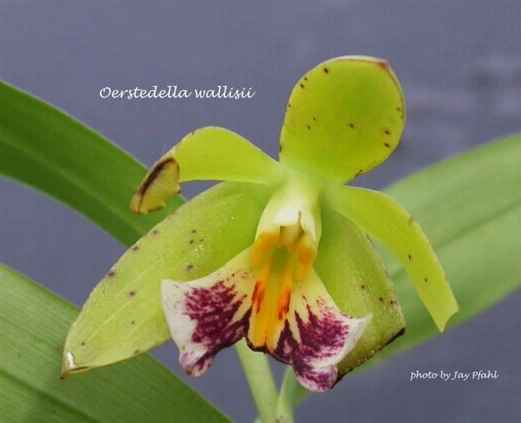 References W3 Tropicos, Kew Monocot list , IPNI ; Die Orchideen Schlechter 1915; Repert. Spec. Nov. Regni Veg. Beih. 7: 253 Schlechter 1920; Atlas des Orchidees Cultivees Constantin 1920 drawing fide; Encyclopedia of Cultivated Orchids Hawkes 1965; AOS Bulletin Vol 38 #7 1969 photo fide; Die Orchideen 3 Auflage Bd 1 Sonderabdruck aus Schlechter Lieferung 9 513 - 576 Brieger, Maatsch and Senghas 1977; AOS Bulletin Vol 49 No 6 1980 photo fide; ORQUIDEA (Méx.) 9(2): 1984 photo fide; Native Colombian Orchids Vol 3 COS 1991 as Oerstedella wallisii photo fide; The Manual Of Cultivated Orchid Species Bechtel, Cribb & Launert 1992 as Oerstedella wallisii photo fide; Icones Planetarum Tropicarum plate 1568 & 1568a Atwood 1993 as Oerstedella wallisii drawings fide; Icones Planetarum Tropicarum plate 1569 Atwood 1993 as Oerstedella wallisii; Rudolf Schlechter Die Orchideen Band 1C lieferung 42 - 43 pg 2626 - 2762 Brieger 2001 as Oerstedella wallisii; Native Ecuadorian Orchids Vol 3 Dodson 2002 photo fide; Manual de Plantas de Costa Rica Vol 3 Hammel, Grayum, Herrera and Zamora 2003 as Oerstedella wallisii drawing fide; Icones Orchidacearum 8 Plate 849 Hagsater 2006 see recognition section; Icones Orchidacearum 8 Plate 871 Hagsater 2006 see recognition section; Icones Orchidacearum 8 Plate 871 Hagsater 2006 see recognition section; Icones Orchidacearum Vol 8 Plate 876 Hagsater & Sanchez 2006 see recognition section; Icones Orchidacearum 8 Plate 899 Hagsater 2006 drawing fide; Orquideologia Vol 26 No 1 2009 photo fide; Orchids of Costa Rica Vol 1 Morales 2009 photo fide; Orchids of the Department of Valle De Cauca Colombia Vol 2 Kolanowska, Hagsater etal. 2014 photo drawing/fide; Orchids of the Darien Gap Kolanowska 2014 drawing fide; Orquideas, Tesoro de Colombia Vol 2 Ortiz & Uribe 2017 drawing/photo fide; Orquideas de Farallones de Cali Galindo-Tarazona, Haelterman, Zuluaga Trochez and Sebastian Moreno 2020 photo fide; Vanishing Beauty, Native Costa Rican Orchids Vol 2 Lacaena to Pteroglossa Pupulin 2020 photo fide
