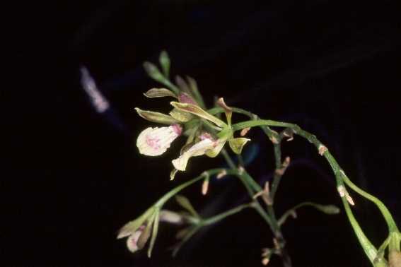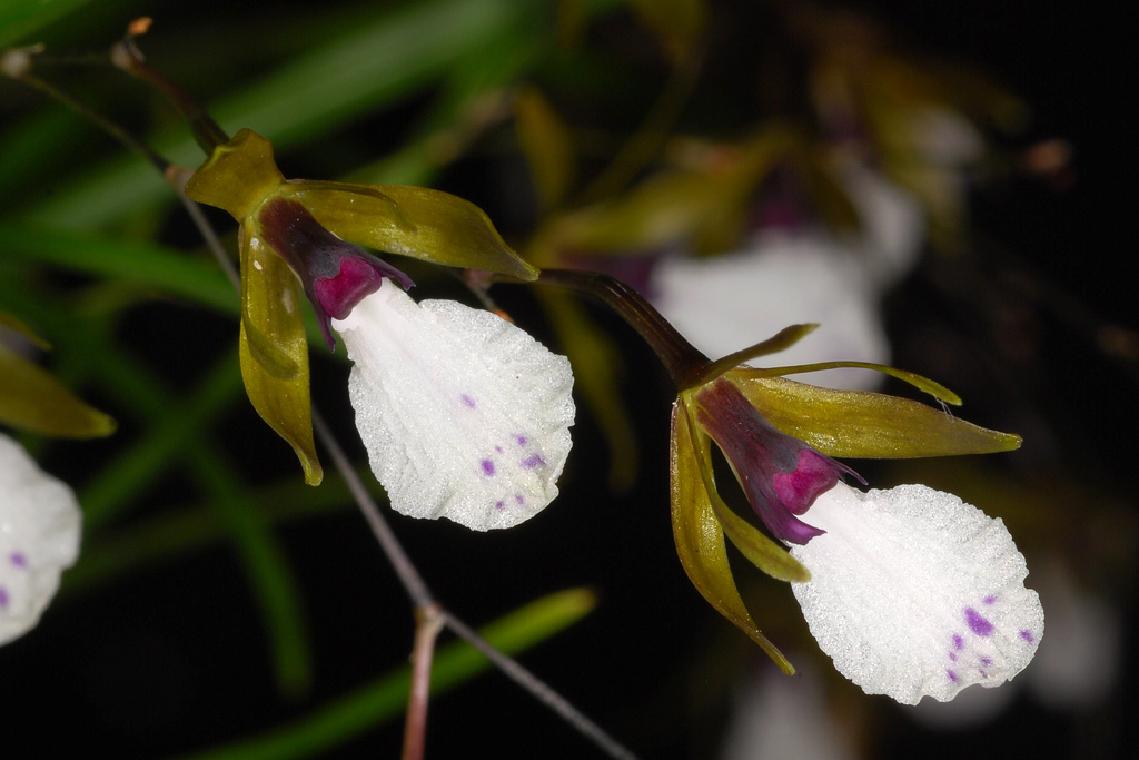 Endemic to Nuevo Leon, Tamaulipas, San Luis Potosi, Guanajuato, Queretaro, Hidalgo, Puebla, Vera Cruz and Oaxaca states of Mexico as a mini-miniature to miniature sized, cool growing epiphyte that occurs in oak forests at elevations of 1500 to 2000 meters with clustered, conical-ovoid pseudobulbs carrying 2 to 3, apical, distichous, arcuate, linear, acute, conduplicate leaves and blooms in the spring and early summer on a terminal, arcuate-pendulous, racemose to 2 to 3 branching, 1 1/2" to 12" [4 to 30 cm] long, slightly fractiflex, slowly successively 1 to 15 flowered inflorescence.