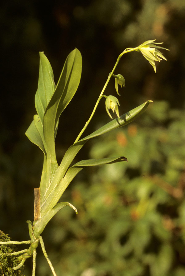 Found in northwestern Venezuela and Ecuador at elevations around 2500 meters as a miniature to small sized, cold growing epiphyte with terete stems and 8" [20 cm] between each ovate, flattened, lightly sulcate pseudobulb enveloped basally by leaf bearing sheaths and carrying a single, apical, oblong-elliptic, acute conduplicate below into the petiolate base leaf that blooms in the summer and early fall on a basal, through the axils of the leaf bearing sheaths, erect, paniculate, to 20" [50 cm] long, many flowered inflorescence.