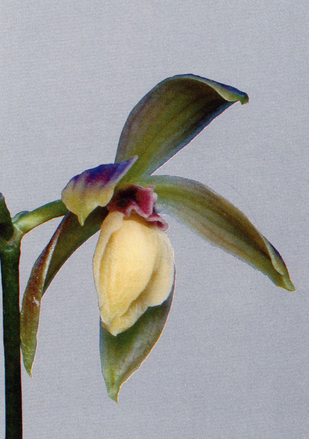 Found in Huila, Cauca and Putumayo states of Colombia as a small sized, cool to cold growing epiphyte with a long repent rhizome giving rise to a short erect stem enveloped completely by distichous, oblong-obovate to oblong-elliptic, acute, gradually narrowing below into the conduplicate, clasping base leaves that blooms on 1 to 2, axillary, erect, to 14" [35 cm] long, remotely 5 to 8 flowered, racemose inflorescence with oblique, ovate-triangular, acute, distant bracts and floral bract and carrying fleshy flowers