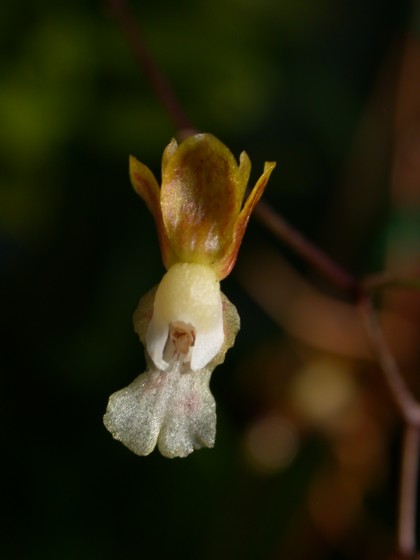Found in Parana' State, Brazil in the coastal Atlantic mountains around 500 to 1000 meters as a miniature sized, warm to cool growing epiphyte with clustered, ovate, laterally compressed pseudobulbs partially enveloped basally by acute, leaflike sheaths and carrying a single, apical, strap-shaped, spreading, fleshy and bluntly pointed apically leaf and blooms on a slender, erect, 4.3" [11 cm] long, few to several flowered inflorescence.