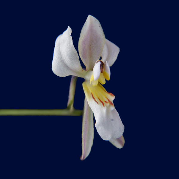 Found in Colombia, Ecuador and Peru at elevations of 2600 to 3200 meters as a miniature sized, cold growing epiphyte with ovate, strongly laterally compressed, roundly 2 edged pseudobulbs carrying 2 apical, lanceolate, acute leaves that blooms in the winter and spring on an erect then arching-pendant, twining, paniculate, heteranthous, 10 to 16 branched, each branch short, few flowered, some fertile, some sterile, to 36" [90 cm] long, many flowered inflorescence carrying flowers that are scentless.