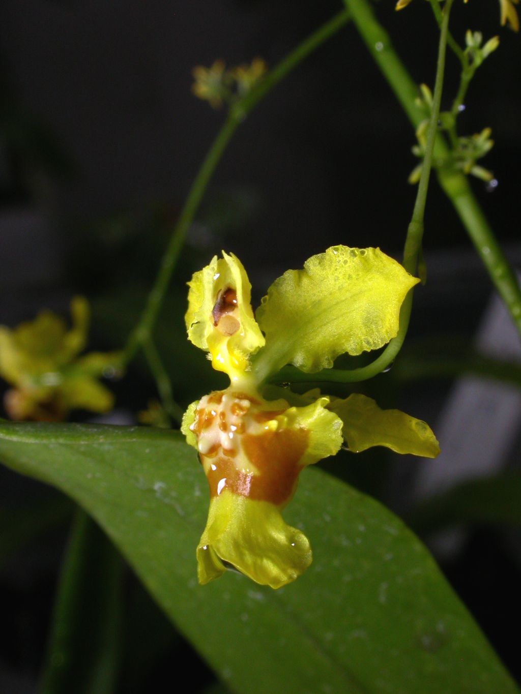 Found in Valle de Cauca department of Colombia in premontane forests at elevations around 1400 meters as a small sized, cool growing epiphyte with closely spaced, narrowly elliptic to narrowly ovate, laterally compressed, ancipitous, slightly rugose pseudobulbs partially enveloped basally by 1 to 2 pairs of, distichous, imbricating leafless sheaths and carrying a single, apical, oblong-lanceolate, obtuse, conduplicate below into the short, narrow base that blooms in the spring and summer on an axillary, arching to nodding, 39 to 51" [100 to 130 cm] long, paniculate, to 30 well spaced branches from end to end, many flowered inflorescence with fragrant [honey], lipped flowers and sterile flowers on the secondary branches and the occassional one on primary branches,