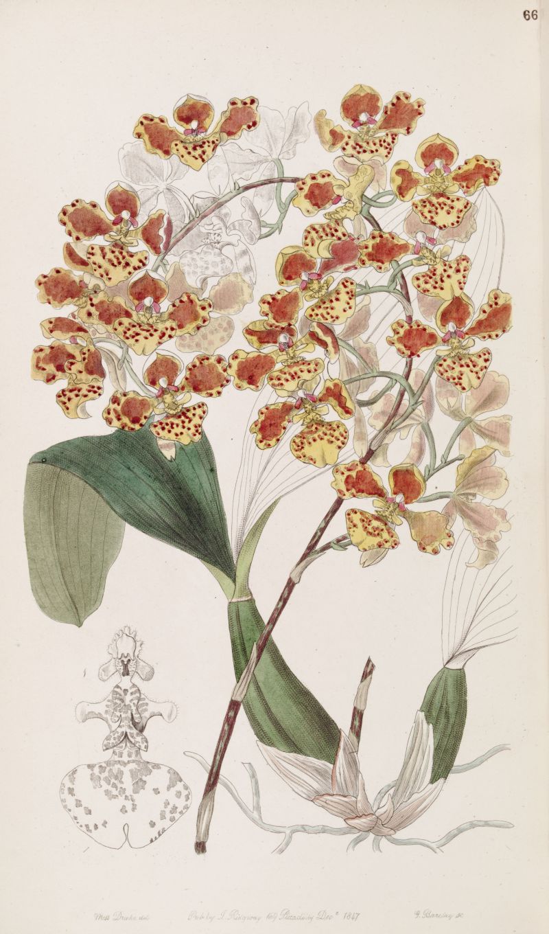 Oncidium × amictum Lindl. 1847 SECTION Waluewa Photo by Edward's Botanical Register Vol 33 pl 66 at Wikipedia Website