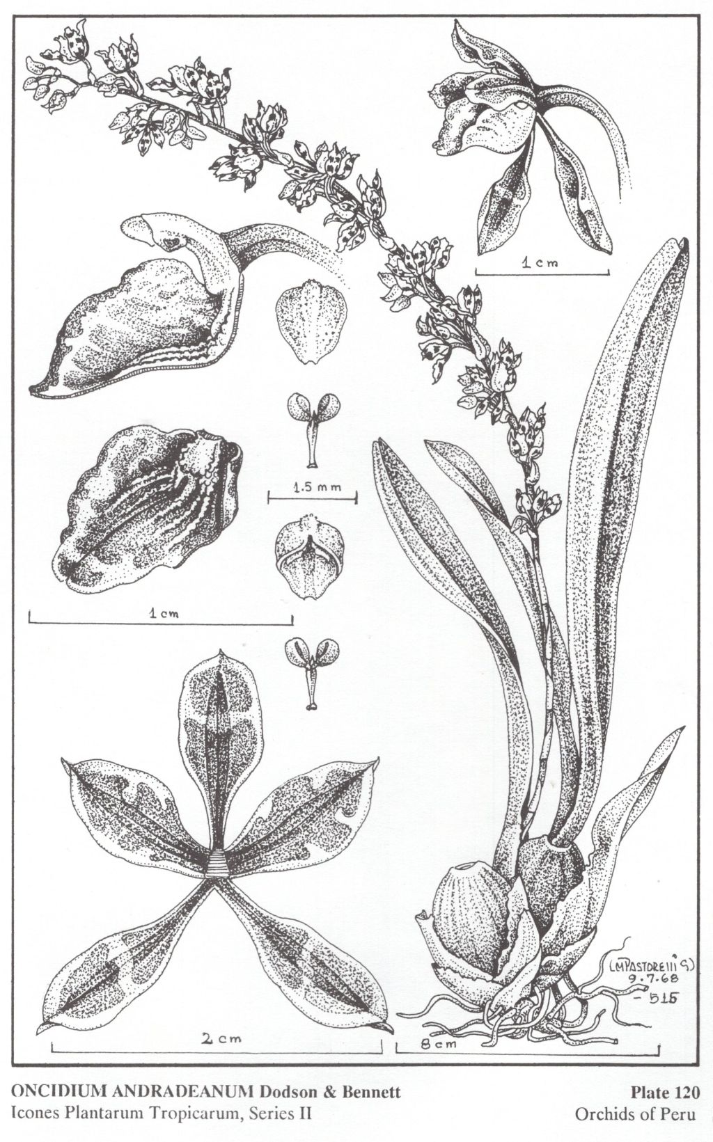 References W3 Tropicos, Kew Monocot list , IPNI ; *Icones Planetarum Tropicarum Plate 120 Dodson & Bennett 1989 drawing fide; Native Ecuadorian Orchids Vol 3 Dodson 2002 photo fide; Orchid Species Culture Odontoglossum/Oncidium Alliance Bakers 2006; Oncidium Vol 3 Koniger 2007 photo/drawing fide much shorter, rounded sepals and petals ;