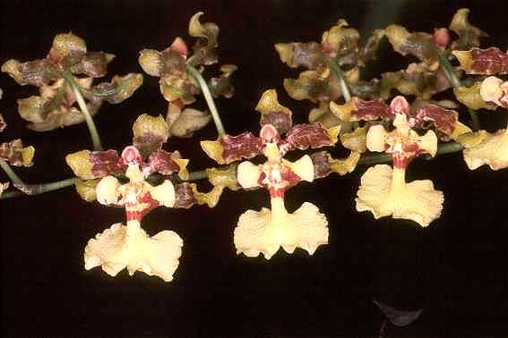 Found from the Leeward Islands, Puerto Rico, the Windwards Islands, Costa Rica, Colombia , Venezuela, Fr Guinea, Guyana, Surinam, Brazil, Ecuador, Peru and Bolivia in tropical, wet montane forests at sealevel to 1300 meters as a large sized, hot to cool growing, massive, caespitose epiphyte with oval, multi ridged, sulcate with time psuedobulbs subtended by several leaf-bearing sheaths with 2 to 3 apical, linear, acuminate leaves blooming in the spring and summer with an erect to pendulous, 5 to 10' [1.4 to 2.5 meters] long, multi-flowered [7 to 20], many branched panicle with lanceolate, acuminate, papery, persistent, conspicuous floral bracts arising on a mature pseudobulb with 7 flowers to each branch.
