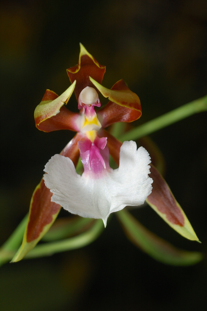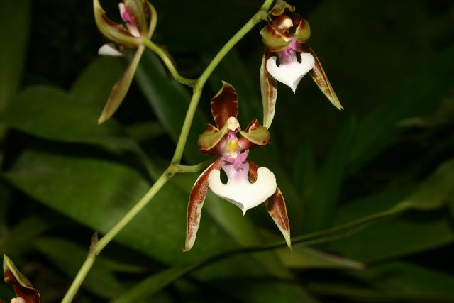 Found in Costa Rica, Panama and Venezuela? at elevations of 1000 to 2400 meters on larger branches in lower montane forest as a medium sized, cool to cold growing epiphyte with sulcate, ovoid, compressed pseudobulbs subtended by foliaceous bracts with 2 apical, coriaceous, elliptic-lanceolate, conduplicate at the base leaves that blooms in the spring, fall and winter on a erect or arching, 4' [120 cm] long, branched, many flowered, paniculate, fractiflex inflorescence arising on a mature pseudobulb with narrowly ovate-triangular, acute floral bracts.